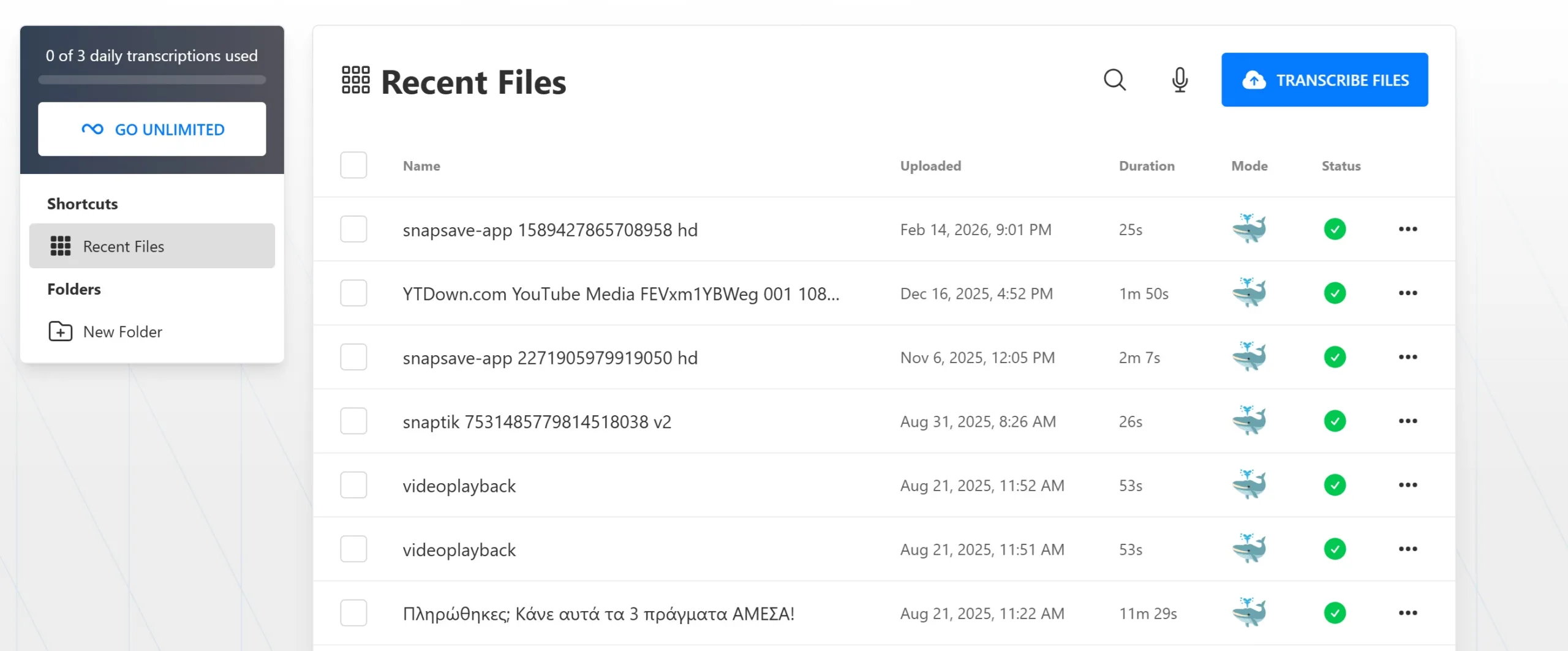 - Έναρξη: Πατήστε “Transcribe”. Η AI θα επεξεργαστεί το αρχείο σας σε ελάχιστα λεπτά (περίπου 2-3 λεπτά ανά ώρα ήχου αν χρησιμοποιηθεί η αποκατάσταση).
