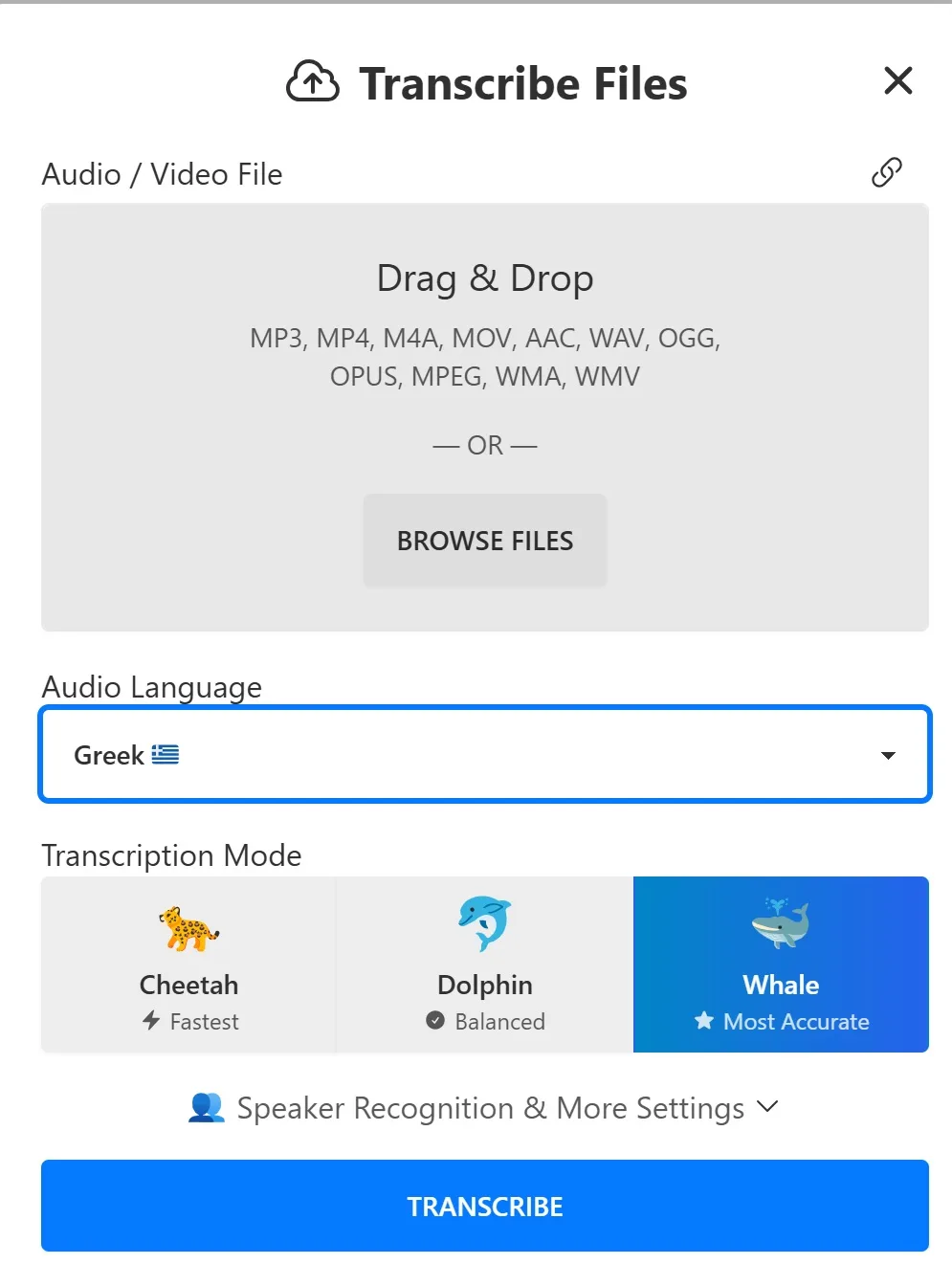 Μπορώ να μετατρέψω ήχο απευθείας στα Αγγλικά;Ναι, επιλέγοντας την επιλογή “Transcribe to English”, η AI μεταφράζει αυτόματα την ομιλία από οποιαδήποτε γλώσσα απευθείας σε αγγλικό κείμενο.